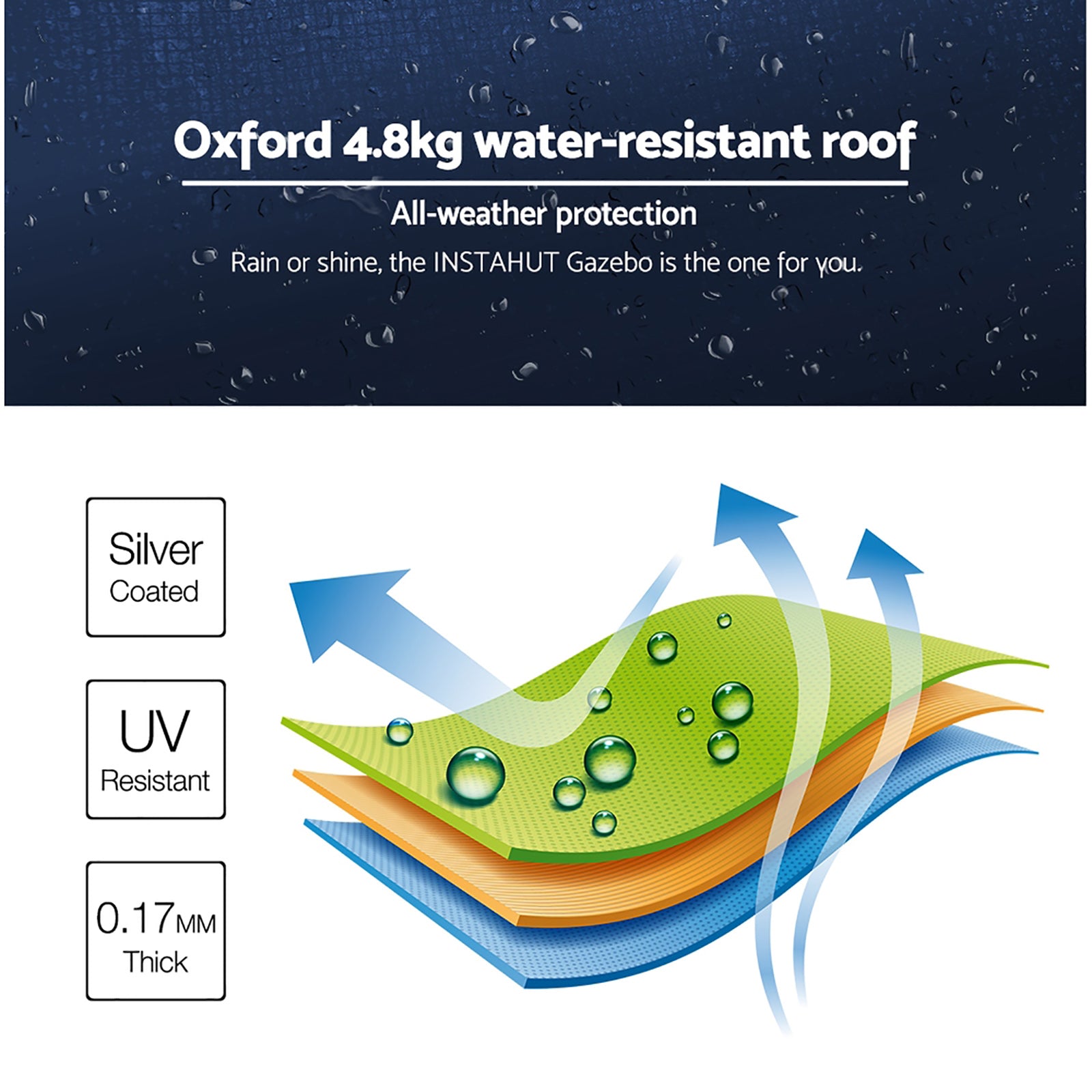 Featuring high density, long lasting PU coating oxford fabric with effective UV and water repellent treatments, this INSTAHUT 3X4.5m Pop Up Gazebo provides a lovely ground and canopy coverage of 300 x 450cm. It is perfect for all your upcoming outdoor activities, as a sunshade station as well as a shelter for unexpected rains.